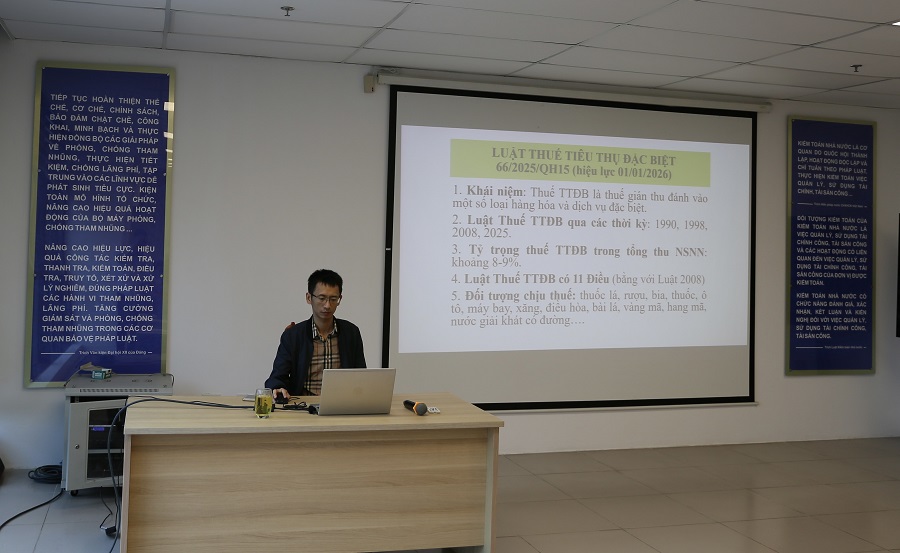 Tại Hội nghị, báo cáo viên tập trung vào các nội dung mới, liên quan trực tiếp đến hoạt động của KTNN như Luật Ngân sách Nhà nước số 89/2025/QH15; Luật Tổ chức chính quyền địa phương số 72/2025/QH15; Luật Thuế tiêu thụ đặc biệt số 66/2025/QH15; Luật Thuế thu nhập doanh nghiệp số 67/2025/QH15; Nghị quyết số 203/2025/QH15 của Quốc hội sửa đổi, bổ sung một số điều của Hiến pháp nước Cộng hòa xã hội chủ nghĩa Việt Nam; Nghị quyết về miễn, hỗ trợ học phí đối với trẻ em mầm non, học sinh phổ thông, người học chương trình giáo dục phổ thông trong cơ sở giáo dục thuộc hệ thống giáo dục quốc dân…