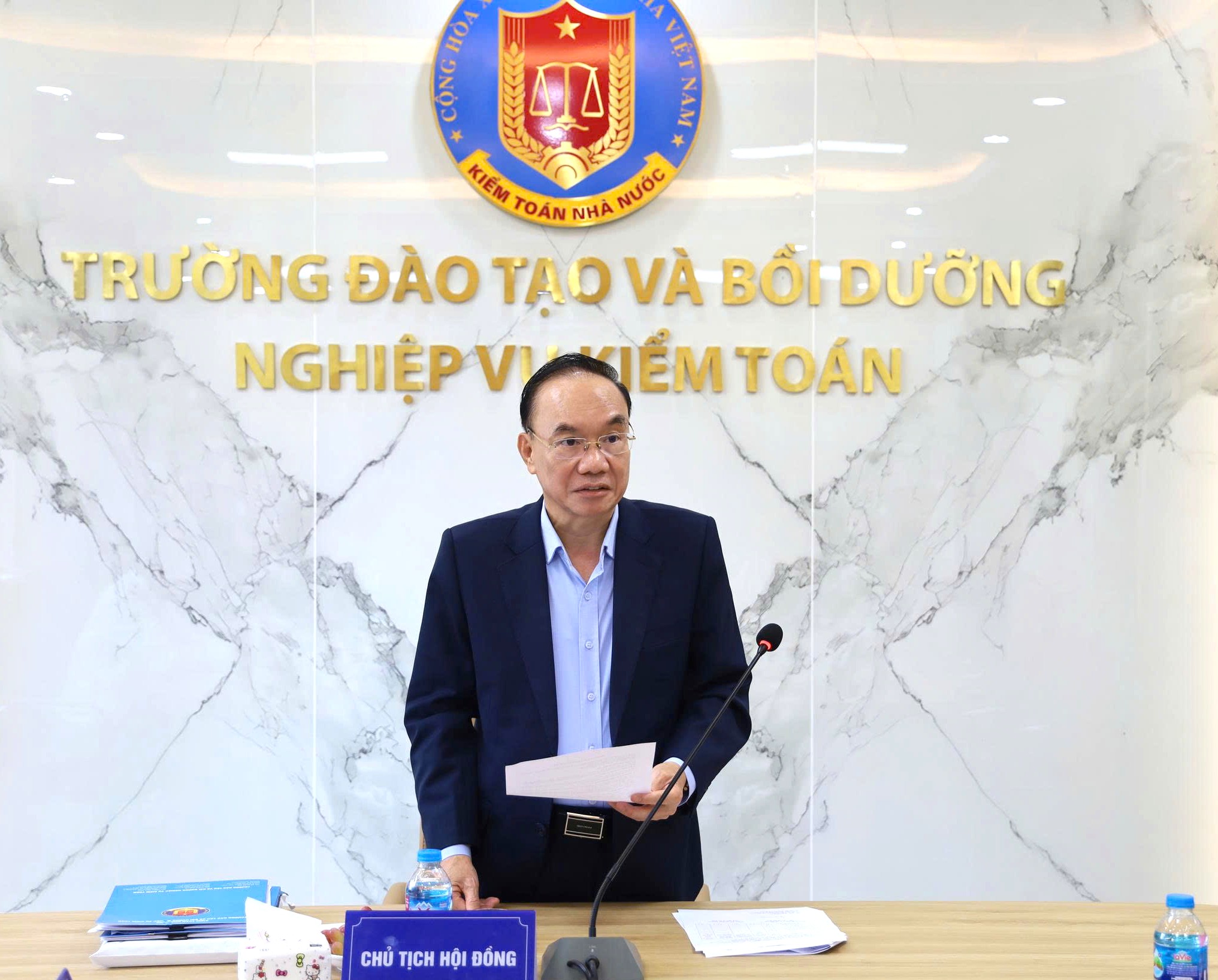 GS,TS. Đoàn Xuân Tiên - Phó Chủ tịch Hội đồng khoa học KTNN, Chủ tịch Hiệp hội Kế toán và Kiểm toán Việt Nam làm Chủ tịch Hội đồng nghiệm thu, cùng tham dự có các thành viên Hội đồng và Ban đề tài.