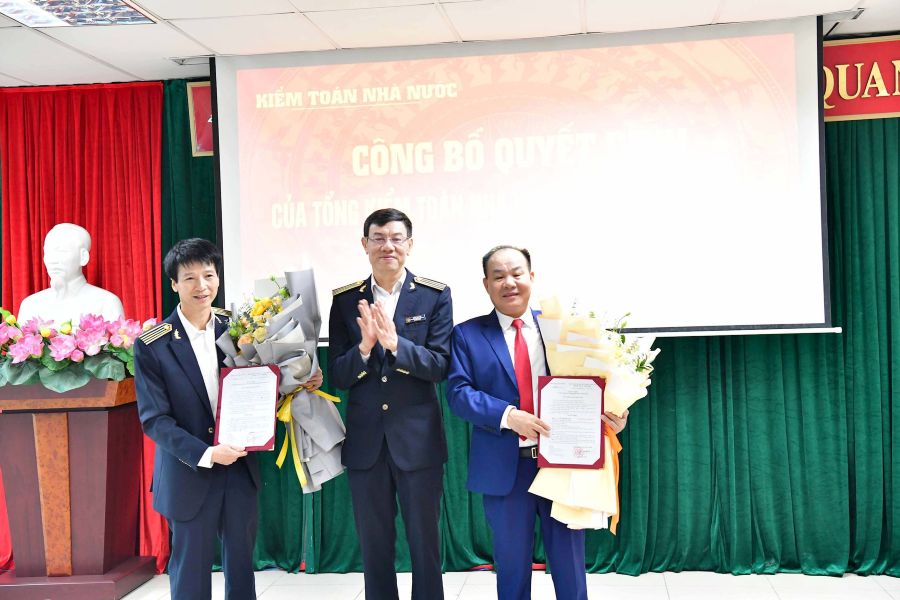 Phó Tổng Kiểm toán nhà nước Doãn Anh Thơ đã trao Quyết định, tặng hoa của KTNN cho đồng chí Vũ Khánh Toàn và đồng chí Vũ An Huy.