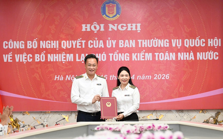 (sav.gov.vn) - Sáng 16/4, tại Hà Nội, Kiểm toán nhà nước (KTNN) tổ chức Hội nghị Công bố Nghị quyết của Ủy ban Thường vụ Quốc hội về việc bổ nhiệm lại Phó Tổng Kiểm toán nhà nước đối với đồng chí Hà Thị Mỹ Dung. Ủy viên Ban Chấp hành Trung ương Đảng, Ủy viên Ban Thường vụ Đảng ủy Quốc hội, Bí thư Đảng ủy, Tổng Kiểm toán nhà nước Nguyễn Hữu Nghĩa trao Nghị quyết và phát biểu chỉ đạo Hội nghị.