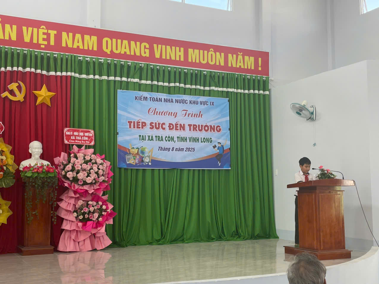 Đại diện KTNN khu vực IX, ông Nguyễn Quang Hồi - Phó Kiểm toán trưởng bày tỏ sự trân trọng và cảm ơn Lãnh đạo tỉnh Vĩnh Long, Ban Lãnh đạo xã Trà Côn đã hỗ trợ, kết nối và tạo điều kiện để Chi đoàn KTNN khu vực IX thực hiện chương trình; Phó Kiểm toán trưởng đã ân cần thăm hỏi sức khỏe, động viên các em học sinh không ngừng nỗ lực, vươn lên để trở thành con ngoan, trò giỏi, những công dân có ích; Ông cũng yêu cầu Ban Chấp hành Chi đoàn KTNN khu vực IX tiếp tục đẩy mạnh hơn nữa phong trào đồng hành với các em - nhất là các em có hoàn cảnh khó khăn, các em thuộc gia đình chính sách, gia đình có công cách mạng trong học tập, cuộc sống, chăm lo thế hệ trẻ.