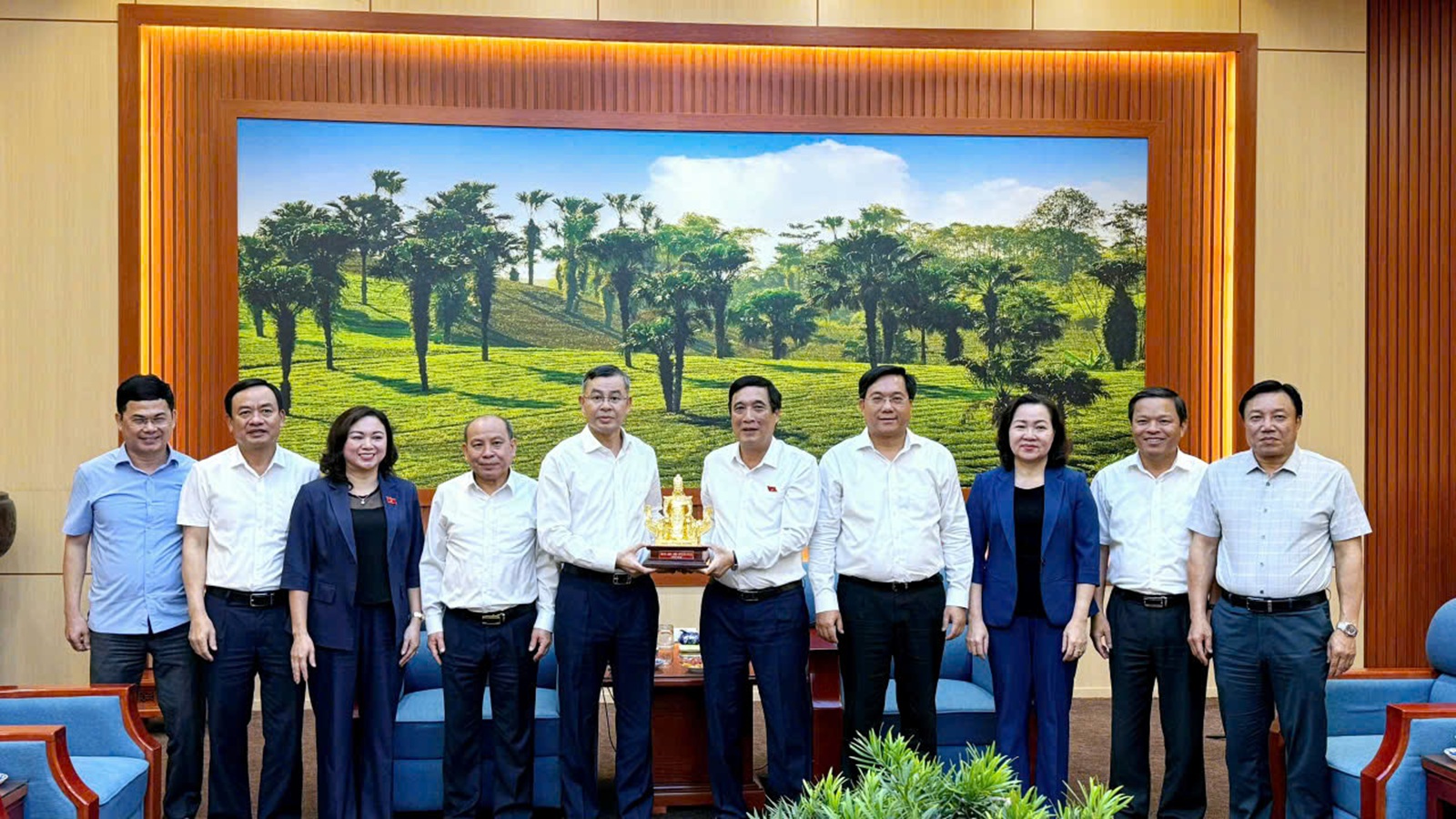 Đồng chí Bùi Minh Châu - Trưởng Đoàn Đại biểu Quốc hội tỉnh Phú Thọ tặng đồng chí Ngô Văn Tuấn - Tổng kiểm toán nhà nước bức tượng Đức Quốc Tổ Lạc Long Quân.