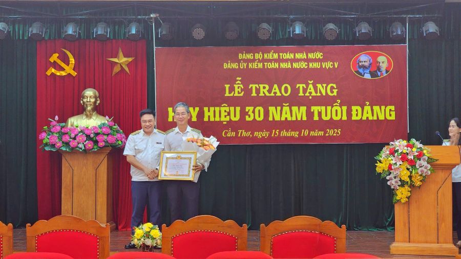 (sav.gov.vn) - Chiều 15/10, tại Trụ sở Kiểm toán nhà nước (KTNN) khu vực V, Đảng ủy KTNN khu vực V đã tổ chức trao tặng huy hiệu 30 năm tuổi Đảng cho đảng viên thuộc Đảng bộ.