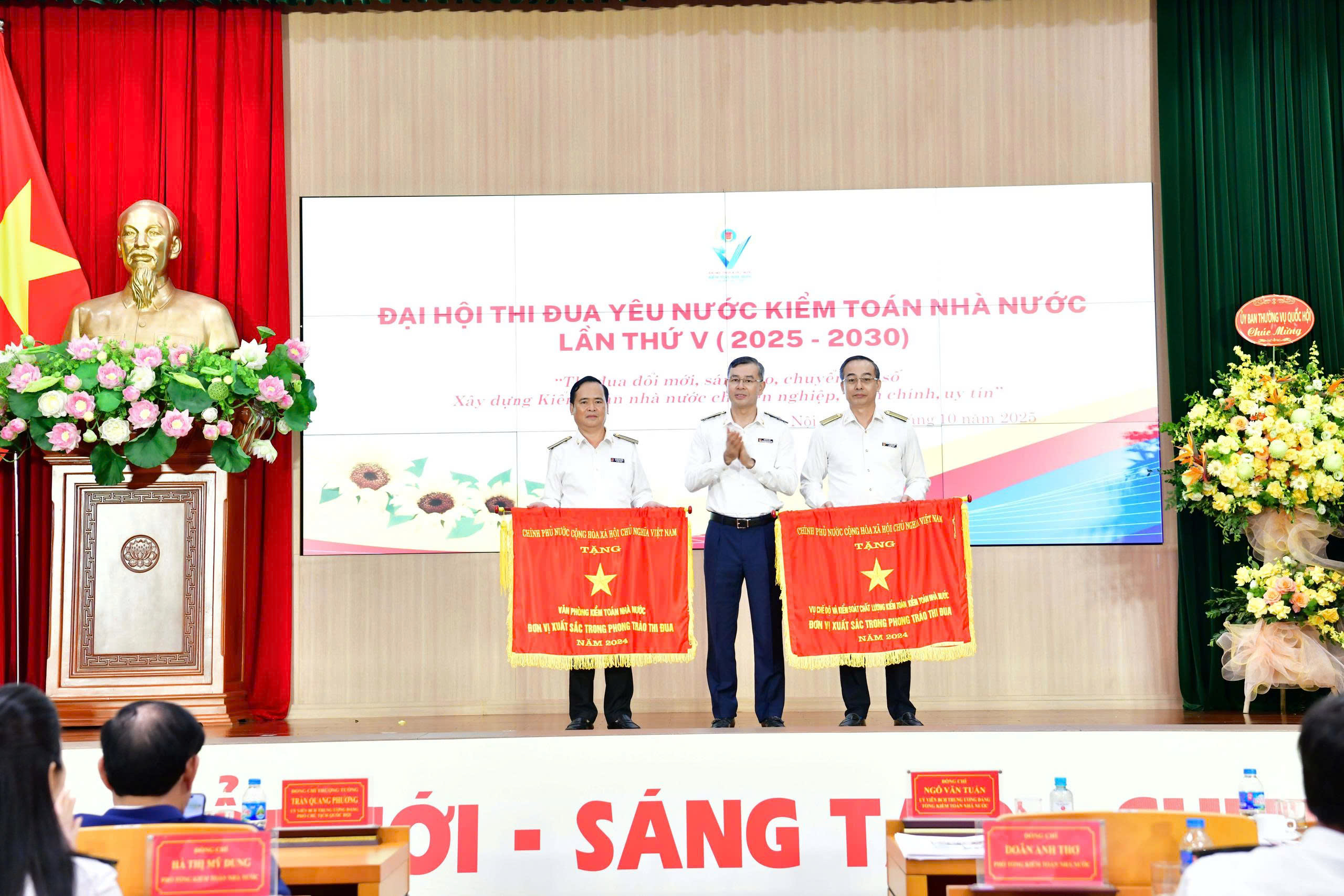 (sav.gov.vn) - Tại Đại hội Thi đua yêu nước Kiểm toán nhà nước (KTNN) lần thứ V (2025-2030), sáng 17/10, các tập thể, cá nhân tiêu biểu, có thành tích xuất sắc trong các phong trào thi đua của Ngành đã được tôn vinh, khen thưởng và trao tặng nhiều danh hiệu thi đua cao quý của Nhà nước, Chính phủ và của KTNN.