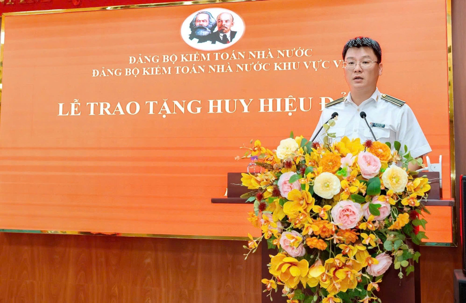 Phó Kiểm toán trưởng KTNN khu vực VIII Lê Văn Tám điều hành Lễ trao tặng Huy hiệu 30 năm tuổi Đảng