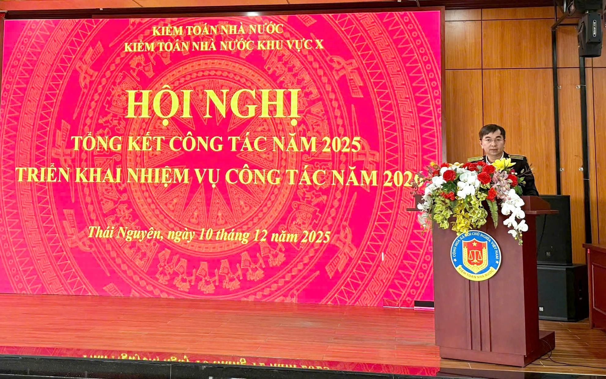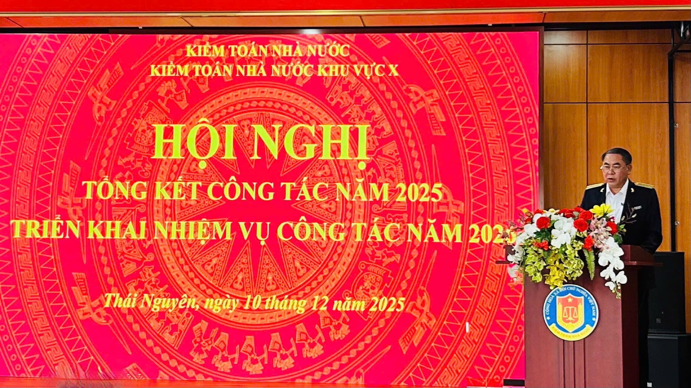 (sav.gov.vn) - Sáng 10/12, tại tỉnh Thái Nguyên, Kiểm toán nhà nước (KTNN) khu vực X tổ chức Hội nghị tổng kết công tác năm 2025 và triển khai nhiệm vụ công tác năm 2026. Ủy viên Ban Thường vụ Đảng ủy KTNN, Phó Tổng Kiểm toán nhà nước Trần Minh Khương dự và chỉ đạo Hội nghị. Tham dự còn có đại diện lãnh đạo các đơn vị trực thuộc KTNN cùng toàn thể lãnh đạo, công chức, người lao động KTNN khu vực X.