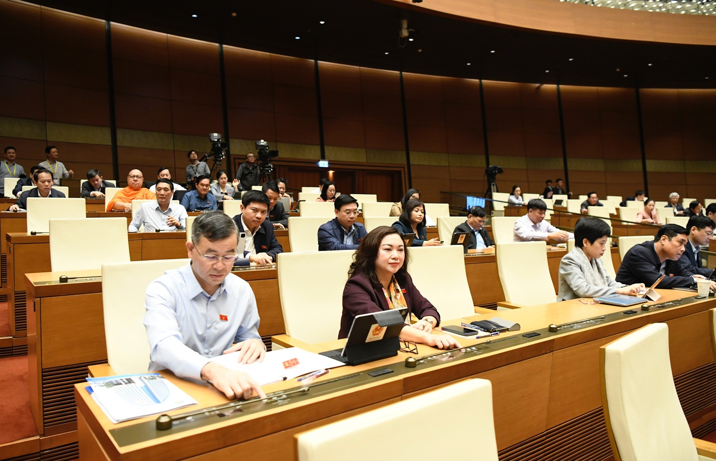 Các đại biểu Quốc hội biểu quyết thông qua Nghị quyết về tiếp tục thực hiện các Nghị quyết của Quốc hội khóa XIV và khóa XV về giám sát chuyên đề và chất vấn. Ảnh: CTV