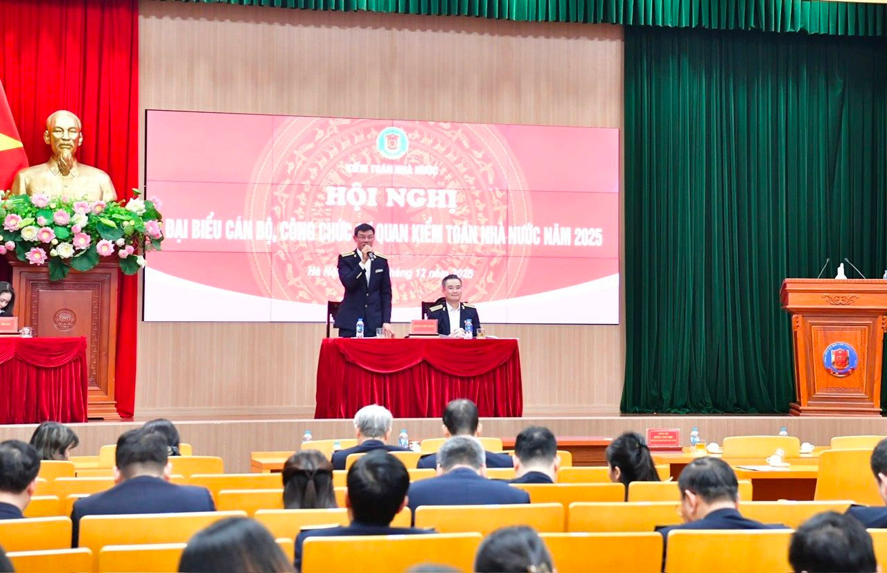 (sav.gov.vn) - Sáng 25/12, tại Hà Nội, KTNN tổ chức Hội nghị Đại biểu cán bộ, công chức cơ quan KTNN năm 2025. Phó Tổng Kiểm toán nhà nước Doãn Anh Thơ và Chánh Văn phòng KTNN Lê Tùng Lâm điều hành Hội nghị.