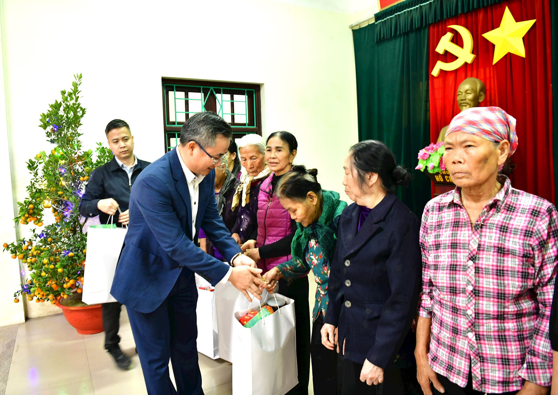 Đoàn công tác tặng 400 suất quà Tết cho hộ nghèo, hộ cận nghèo, hộ có hoàn cảnh khó khăn, công nhân, người lao động có hoàn cảnh khó khăn trên địa bàn xã Liên Bão (tỉnh Bắc Ninh). Ảnh: HỒNG NHUNG